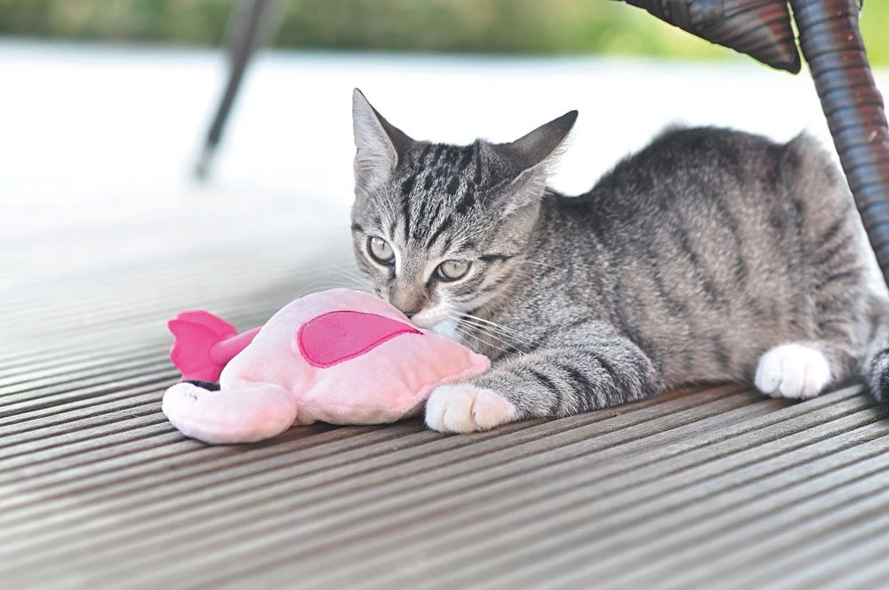Aber der Flamingo hat noch mehr zu bieten als nur einen betörenden Duft. Mit einer stattlichen Grösse von 14 x 4 cm lädt er zu ausgiebigem Ganzkörperspiel ein. Ihre Katze kann ihn werfen, herumwirbeln lassen oder ihre Klauen tief in sein weiches Federkleid graben. Dank des Dinkelspelzes im Inneren bietet der Flamingo auch nach zahlreichen wilden Spielrunden noch lebhafte Textur und langanhaltenden Spielspass.