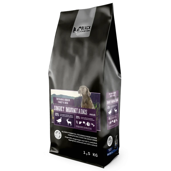 BLACK CANYON Smoky Mountain Adult – Truthahn & Hirsch ist ein natürliches und hochwertiges Futter ohne künstliche Konservierungs- oder Farbstoffe. Es ist für alle Rassen und Grössen von ausgewachsenen Hunden geeignet und wird Ihrem Hund garantiert schmecken.