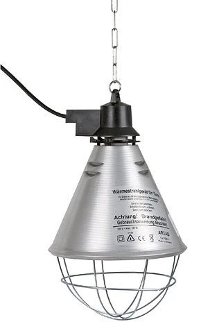 Alu-Schirm ø 21 cm, mit 6 Lüftungsschlitzen für bessere Luftzirkulation, dadurch längere Lebensdauer der Infrarot-Lampe. Inklusive Befestigungskette (max. 20 kg Tragkraft). Max. 175 W Leuchtmittel für Geräte mit Sparschalter!. Inklusive Schweizer Stecker. Exklusive Glühbirne.