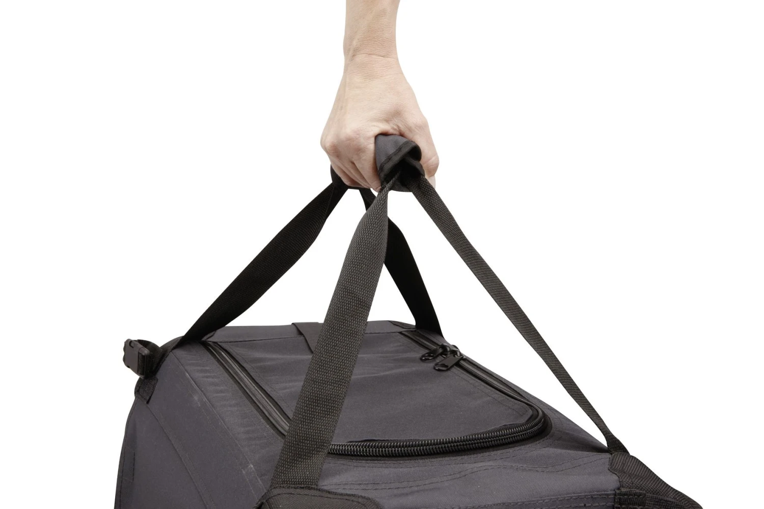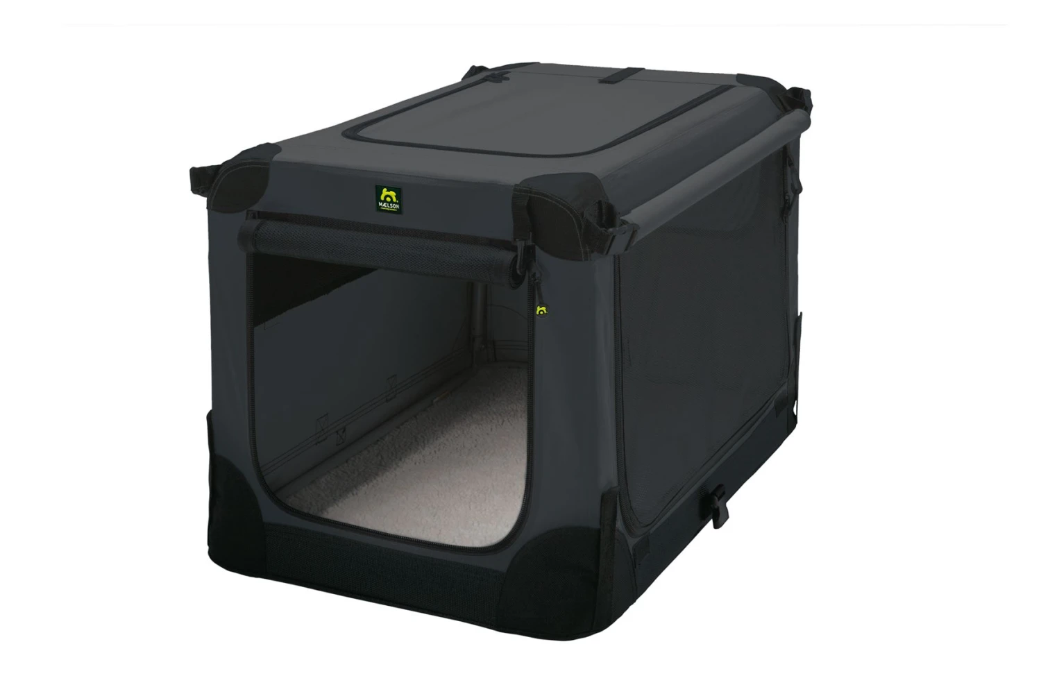 Faltbare Transportbox, mit robustem Stahlrahmen und drei Einstiegsmöglichkeiten – vorne, oben und seitlich. Extra starkes Netzgitter an Türen und Fenstern, Rollos auf drei Seiten zum Verdunkeln der Box. Mit Sicherheitsgurtlaschen für den Transport im Fahrzeug. Der Boden ist wasserdicht und die Einlegematte ist waschbar. Ideal für Zuhause, unterwegs oder im Hotelzimmer.