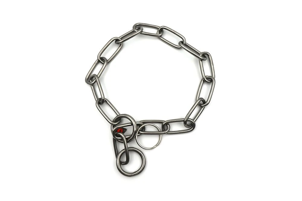 Halskette aus rostfreiem Edelstahl. Gliederstärke 4 mm, Breite 1.6 cm, Länge 4 cm. Für langes und feines Fell empfohlen. Für Hunde mit Körpergewicht bis 85 kg. Seit der Revision des Tierschutzgesetzes vom 1.1.2014 (Art. 73, Abs. 2) ist die Verwendung von Zughalsbändern ohne Stopp verboten. Zu jedem Kettenhalsband wird Ihnen deshalb ein Stoppring mitgeliefert, welchen Sie entsprechend dem Halsumfang des Hundes so anbringen, dass ein Zug auf das Halsband bzw. ein Würgen des Hundes ausgeschlossen ist.